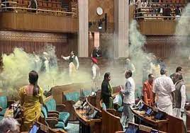 બુધવારે સંસદ પર હુમલાની 22મી વરસીએ મોટી સુરક્ષા ચૂકનો મામલો સામે આવ્યો હતો. આ દરમિયાન બે લોકો સંસદની દર્શકોની ગેલરીમાંથી કૂદીને સંસદમાં ઘૂસી આવ્યા હતા અને તેમણે સ્મોક બોમ્બ સળગાવી અફરા તફરી મચાવી હતી. જોકે આ બંને લોકોને સાંસદોએ જ પકડી પાડ્યા હતા.