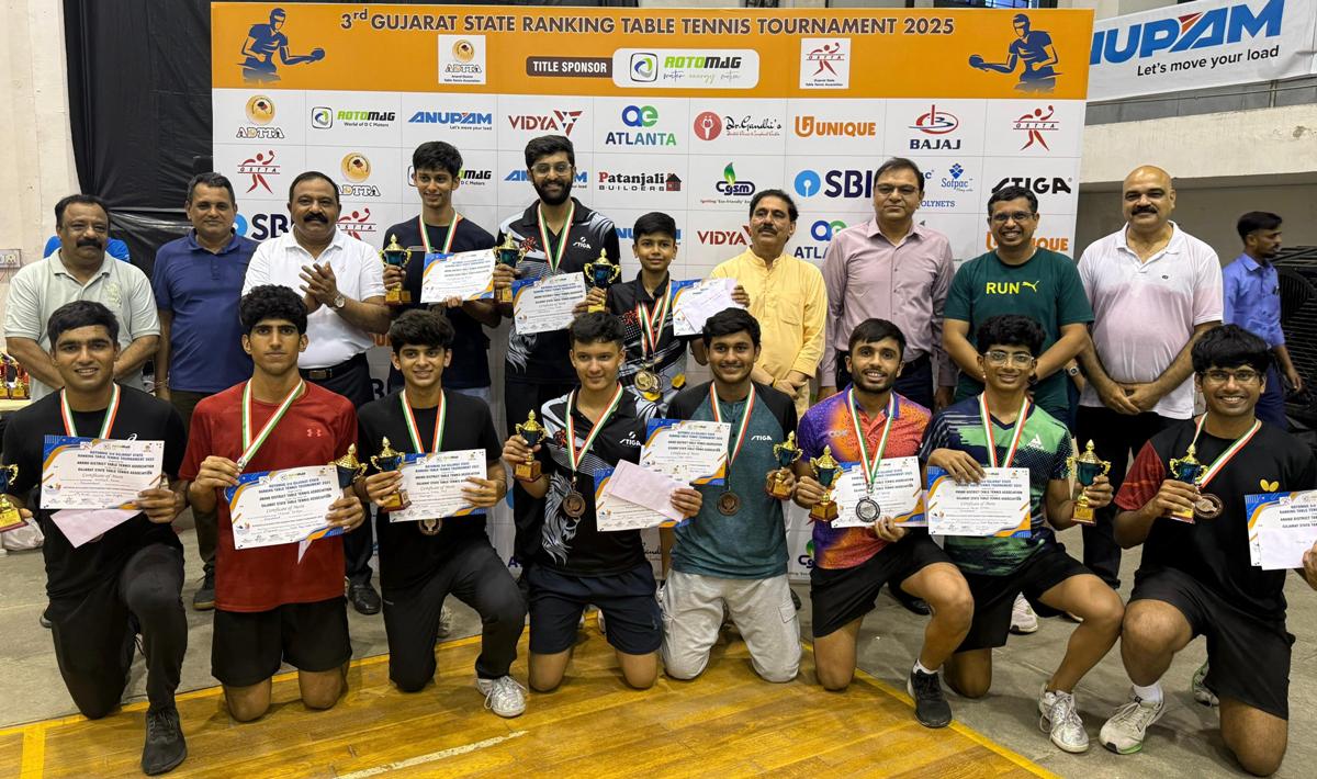 ગુજરાત સ્ટેટ ટેબલ ટેનિસ એસોસિયેશન (જીએસટીટીએ)ના નેજા હેઠળ અને આણંદ ડિસ્ટ્રિક્ટટ ટેબલ ટેનિસ એસોસિયેશન (એડીટીટીએ)ના ઉપક્રમે 10થી 13મી જુલાઈ દરમિયાન અહીંના યુગપુરુષ વિવેકાનંદ સ્પોર્ટ્સ કોમ્પલેક્સ (બાકરોલ, આણંદ)ખાતે આયોજિત રોટોમેગ ત્રીજી ગુજરાત સ્ટેટ રેન્કિંગ ટેબલ ટેનિસ ચેમ્પિયનશિપ 2025માં અમદાવાદના બીજા ક્રમાંકિત ચિત્રાક્ષ ભટ્ટે શાનદાર રમત દાખવી વડોદરાના પ્રથમ માદલાણીને 4-1 હરાવવાની સાથે મેન્સ ટાઇટલ જીતી લીધું હતું.