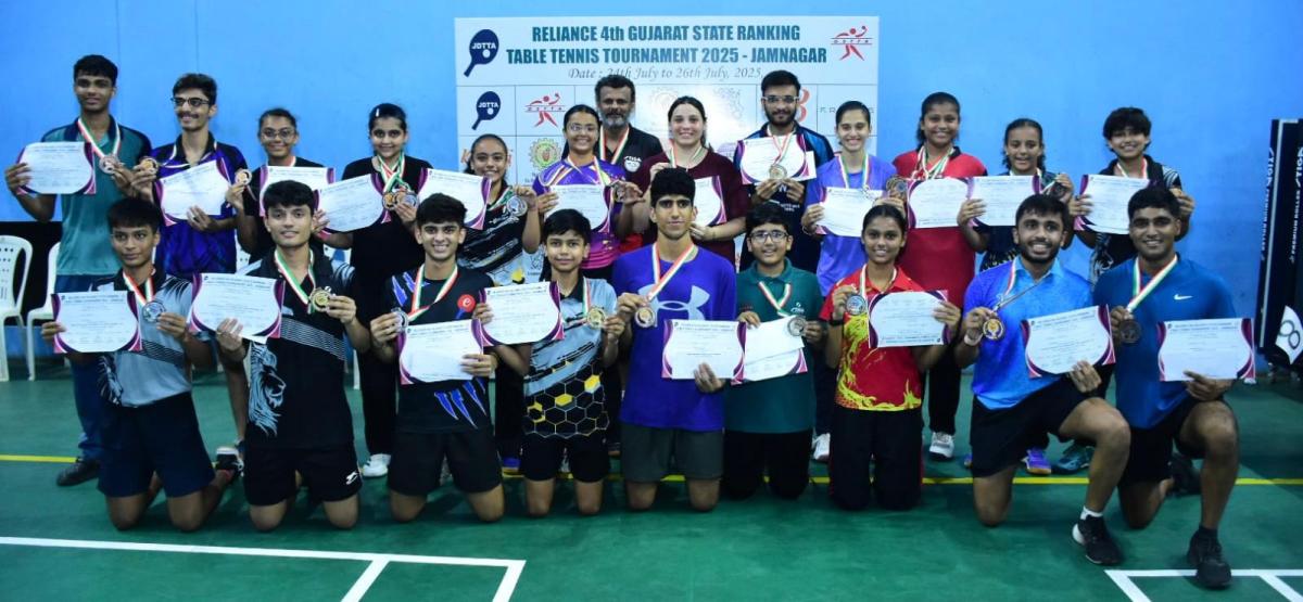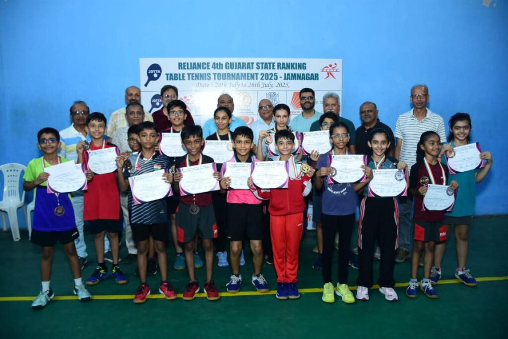 In the Reliance 4th Gujarat State Ranking Table Tennis Tournament held at JMC Sports Complex (Jamnagar) here under the auspices of Gujarat State Table Tennis Association and under the initiative of Jamnagar District Table Tennis Association, top-ranked Dhairya Parmar (Ahmedabad) defeated 46-year-old Jignesh Jaiswal (Bhavnagar), the oldest and most experienced player in Gujarat table tennis, 4-2, to win the men’s title. The tournament was held at JMC Sports Complex, Jamnagar from July 24 to 26.