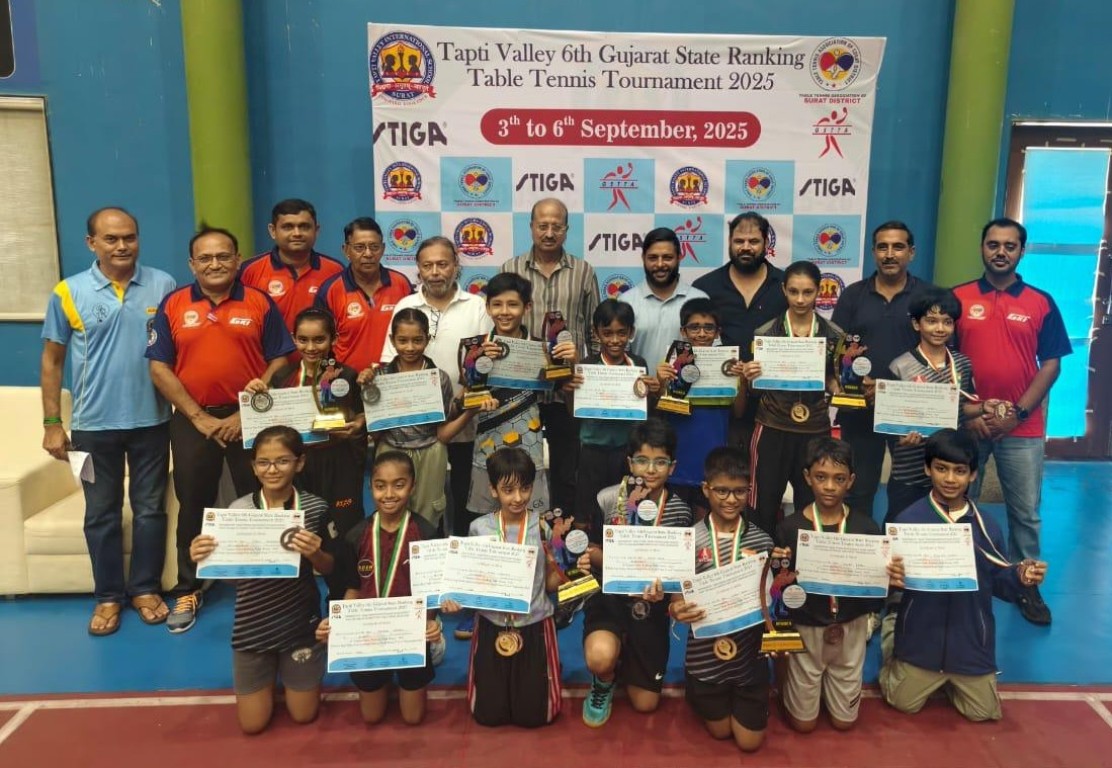 ગુજરાત સ્ટેટ ટેબલ ટેનિસ એસોસિયેશન (જીએસટીટીએ)ના નેજા હેઠળ સુરત ડિસ્ટ્રિક્ટ ટેબલ ટેનિસ એસોસિયેશન (ટીટીએએસડી)ના ઉપક્રમે ત્રીજીથી છઠ્ઠી સપ્ટેમ્બર દરમિયાન અહીંની તાપ્તિ વેલી ઇન્ટરનેશનલ સ્કૂલ, નાર્થન ખાતે યોજાયેલી તાપ્તિ વેલી છઠ્ઠી ગુજરાત સ્ટેટ રેન્કિંગ ટેબલ ટેનિસ ટુર્નામેન્ટમાં શનિવારે અંડર-13માં મોખરાના ખેલાડી ધ્રુવ ભંભાણી અને ગર્લ્સમાં વિન્સી તન્નાએ પોતાનું વર્ચસ્વ જાળવી રાખીને ટાઇટલ જીતી લીધા હતા.