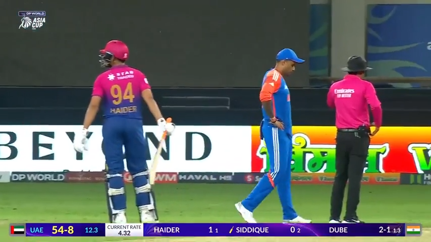 આ ઘટના UAEની ઇનિંગની 13મી ઓવરમાં બની હતી, જેમાં યુએઈના સ્કોરબોર્ડ પર 54-8નો નિરાશાજનક સ્કોર હતો. શિવમ દુબેના એક ઊંચા આવતા બોલ પર જુનૈદ સિદ્દીક રમવાના પ્રયાસમાં બોલ ચૂકી ગયો અને ક્રીઝની બહાર ઊભો રહી ગયો હતો જેમાં સંજુ સેમસને અંડર-આર્મ્ડ બોલ ફેંકીને સ્ટંપ ઊડાડી દેીધા હતા . થર્ડ અમ્પાયર, રુચિરા પલ્લીયાગુરુગે, સિદ્દીકીને આઉટ જાહેર કરતા સુર્યકુમાર મેદાન પરના અમ્પાયર પાસે ગયો અને અપીલ પાછી ખેંચી લીધી – કેમકે બોલ ફેંકવા સમયે સ્ટ્રાઈક દરમિયાન દુબેનો નેપકીન પડી ગયો હતો, જે તરફ સિદ્દીકીએ તરત જ નિર્દેશ કર્યો હતો.