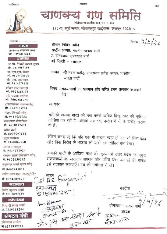 राष्ट्रीयधर्म गुरुओं का लगातार अपमान व चरित्र हनन के खिलाफ भाजपा व कांग्रेस पार्टियो को ज्ञापन दीया गया AdminApril 13, 2026April 13, 202601 mins Spread the love जयपुर सनातन धर्म के सबसे बड़े धर्म गुरुओं शंकराचार्यों का जो लगातार अपमान व चरित्र हनन किया जा रहा है उसके खिलाफ भाजपा व कांग्रेस दोनों पार्टियो को कल दिनांक 10 अप्रेल को ज्ञापन दिया और कड़े शब्दों में इसको रुकवाने के लिए कहा। Post navigation Previous: વડોદરામાં 20થી 26 એપ્રિલે શક્તિ ગ્રાન્ડેયુર 9.0 આંતરરાષ્ટ્રીય ઓપન ફિડે રેટિંગ ચેસ ટુર્નામેન્ટ-2026Next: चाणक्य गण समिति की टीम ने भगवद्स्वरूप जगद्गुरु शंकराचार्य स्वामी अविमुक्तेश्वरानंद जी से भेंट की Leave a Reply Cancel replyYour email address will not be published. Required fields are marked *Comment * Name * Email * Website Save my name, email, and website in this browser for the next time I comment.
